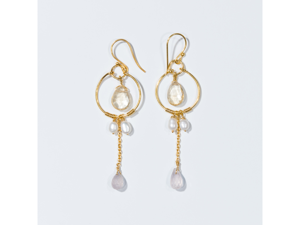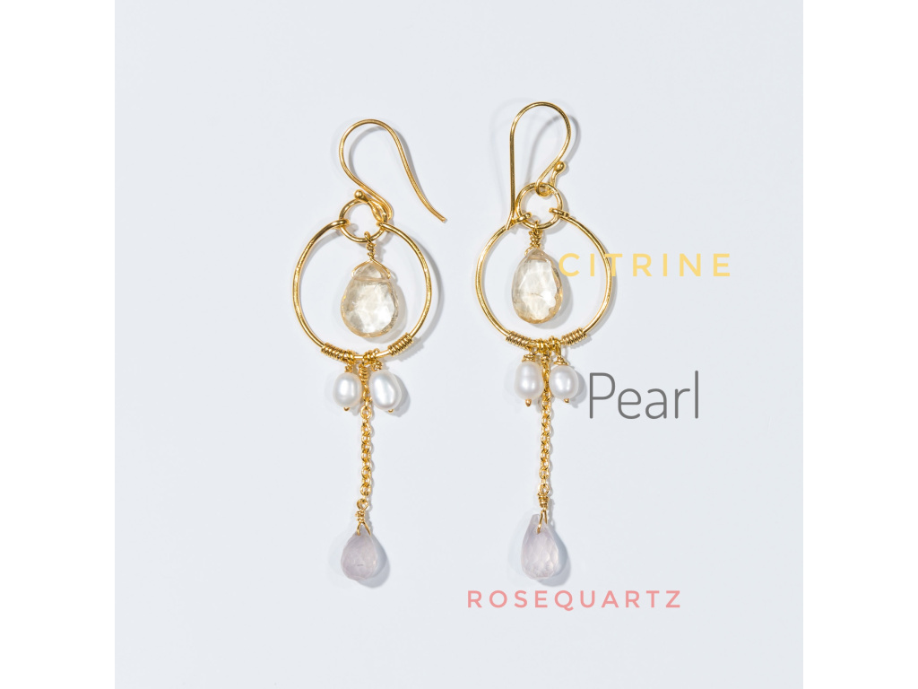 Jemné, ženské a přitom výrazné. Tyto ručně vyráběné náušnice kombinují teplý třpyt citrínu, nadčasovou eleganci perel a něžnou energii růženínu. Zlacené kruhy s jemným řetízkem vytvářejí lehký pohyb, který náušnicím dodává živost a sofistikovaný vzhled.