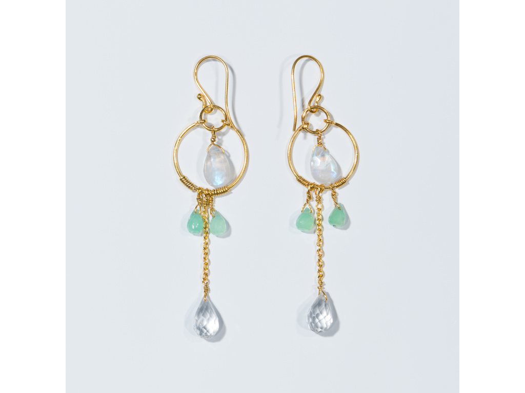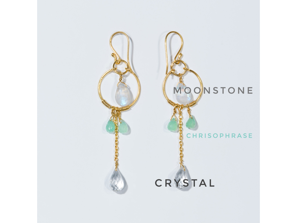 Éterické, svěží a přirozeně elegantní. Tyto ručně vyráběné náušnice spojují jemný lesk měsíčního kamene, svěží zelené tóny chryzoprasu a čistotu čirého křišťálu. Zlacený kruh s jemným řetízkem vytváří lehký pohyb a dodává šperku vzdušnost a sofistikovaný výraz.