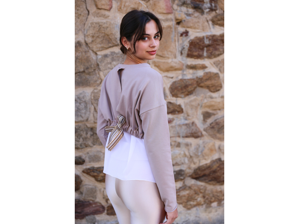 Pohodlná mikina v elegantním střihu imituje dvě vrstvy oblečení - delší tričko vzdušného materiálu a krátce střiženou mikinu na zádech, kterou zdobí zajímavý detail barevné stuhy. Sofistikovaný střih podtrhuje ženskost a navíc si můžete volnost mikiny upravit dle osobních preferencích. Stuha má zkrátka funkci jak estetickou, tak praktickou.