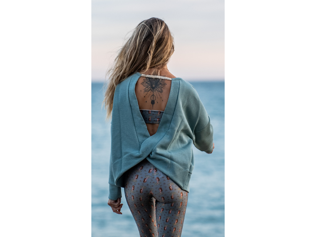 Rafinovaná oversize mikina s otevřenými zády nechá vyniknout nejen vaše záda, ale i sportovní podprsenku. Látka je protkaná stříbrnou nitkou, která dodává mikině šmrnc. Vzadu je pletený copánek.