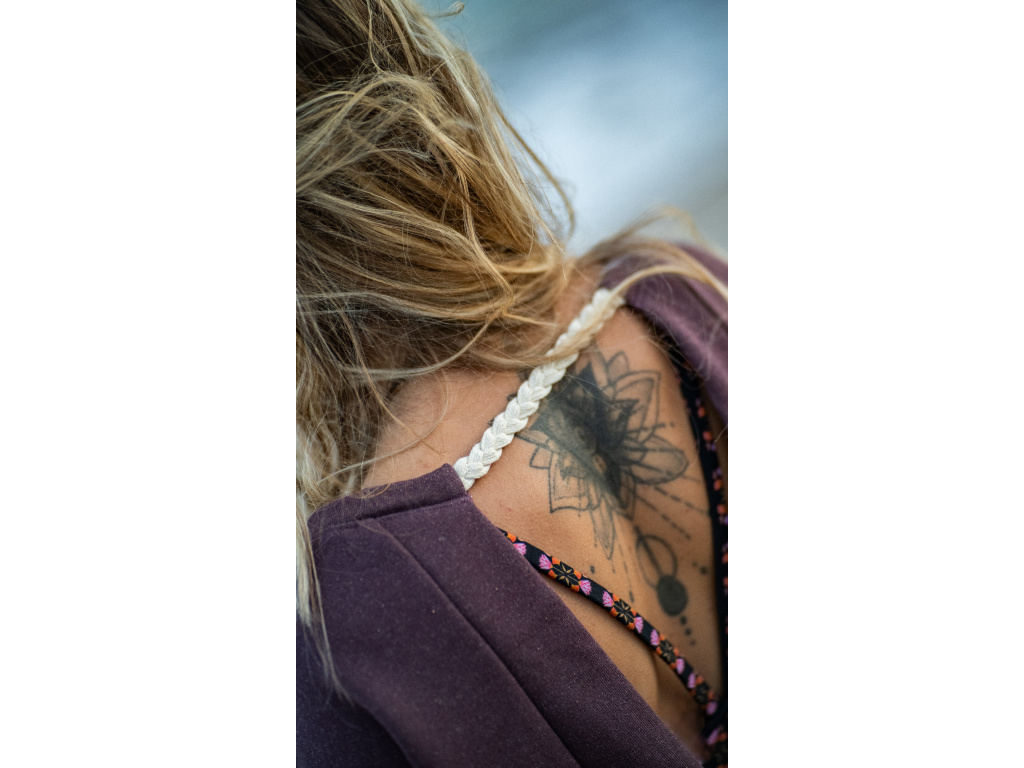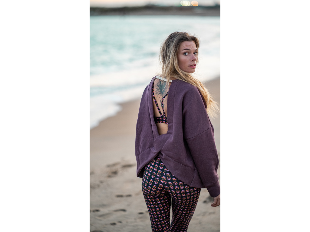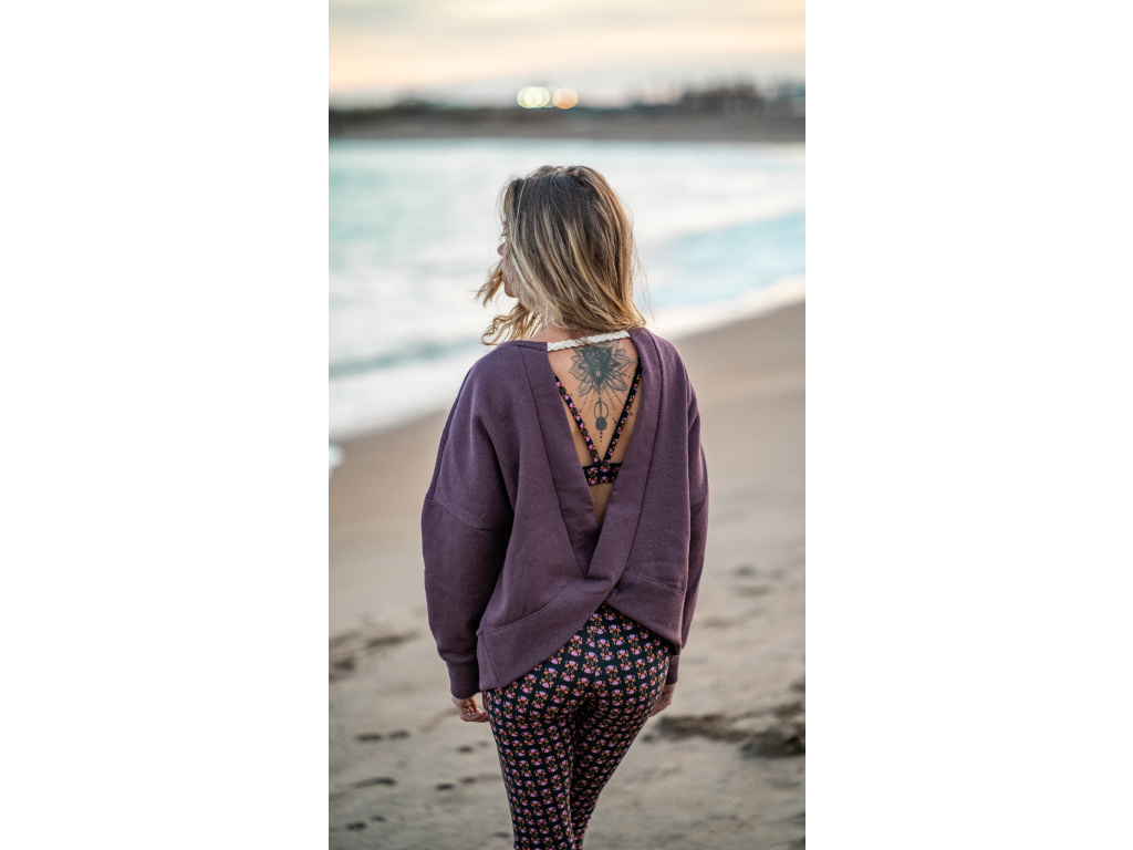 Rafinovaná oversize mikina s otevřenými zády nechá vyniknout nejen vaše záda, ale i sportovní podprsenku. Látka je protkaná stříbrnou nitkou, která dodává mikině šmrnc. Vzadu je pletený copánek.