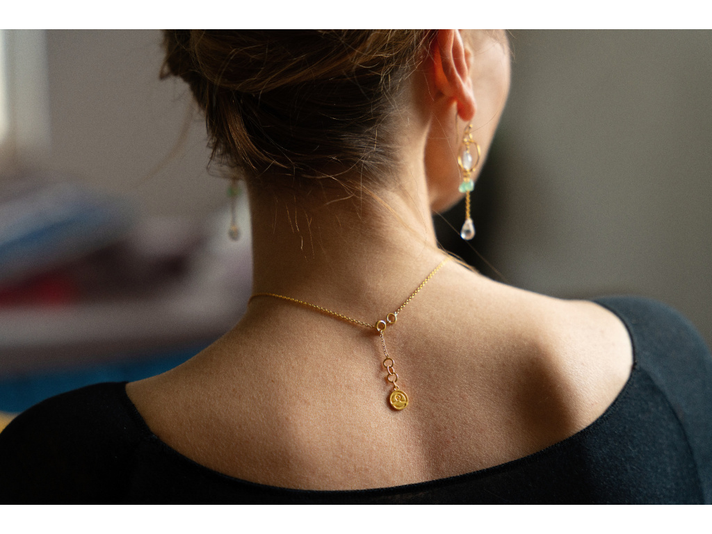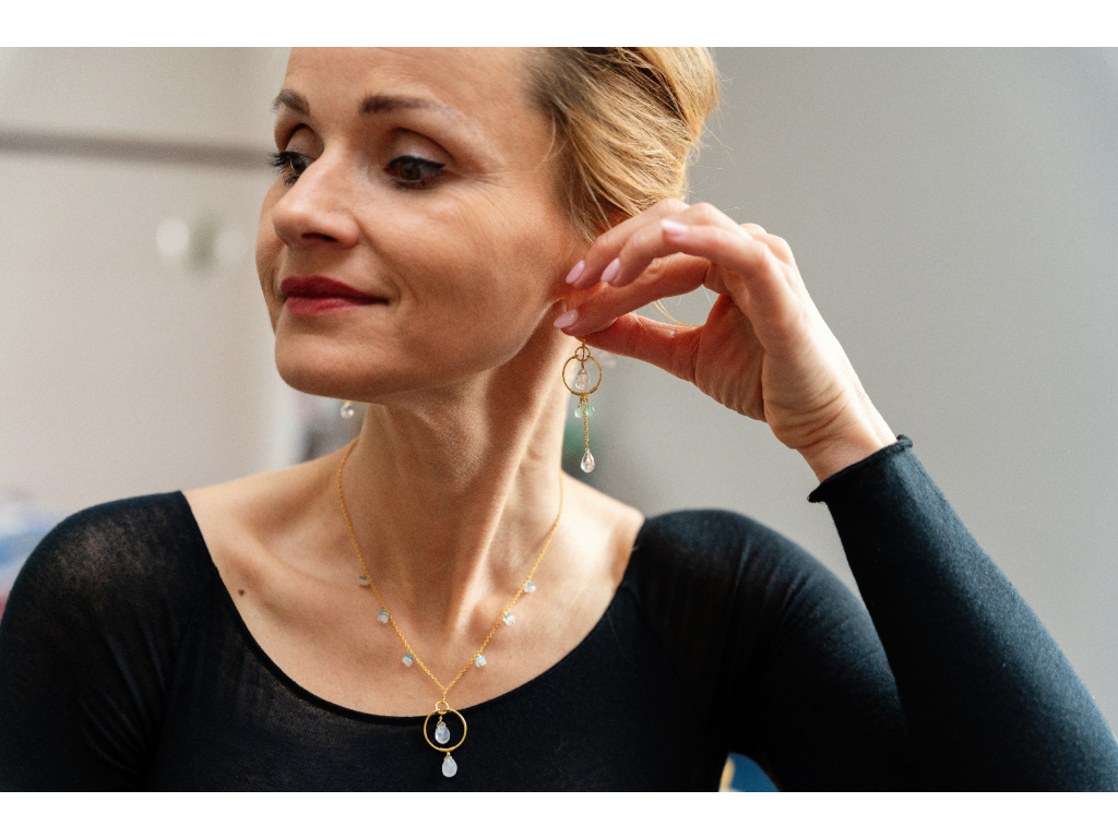 Éterické, svěží a přirozeně elegantní. Tyto ručně vyráběné náušnice spojují jemný lesk měsíčního kamene, svěží zelené tóny chryzoprasu a čistotu čirého křišťálu. Zlacený kruh s jemným řetízkem vytváří lehký pohyb a dodává šperku vzdušnost a sofistikovaný výraz.