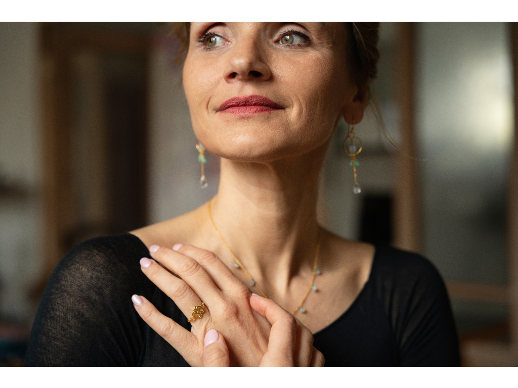 Měsíční kámen je symbolem intuice a ženské energie, chryzopras podporuje harmonii a vnitřní klid a křišťál je známý jako kámen čistoty a rovnováhy. Společně tvoří nadčasový šperk, který jemně podtrhne osobnost nositelky.
