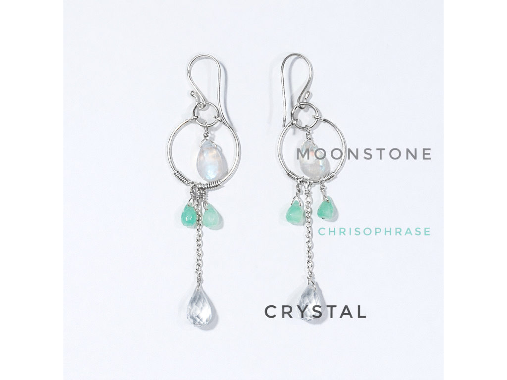 Éterické, svěží a přirozeně elegantní. Tyto ručně vyráběné náušnice spojují jemný lesk měsíčního kamene, svěží zelené tóny chryzoprasu a čistotu čirého křišťálu. Stříbrný kruh s jemným řetízkem vytváří lehký pohyb a dodává šperku vzdušnost a sofistikovaný výraz.