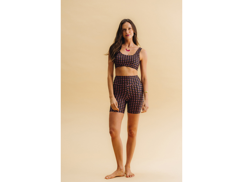 Podprsenka je vyrobena z lehké, vysoce elastické tkaniny. Přiléhavý kousek má výstřih ve tvaru U, zdvojená střední ramínka překřížené vzadu, gumu zabudovanou v lemu, vnitřní podšívku a exkluzivní potisk.