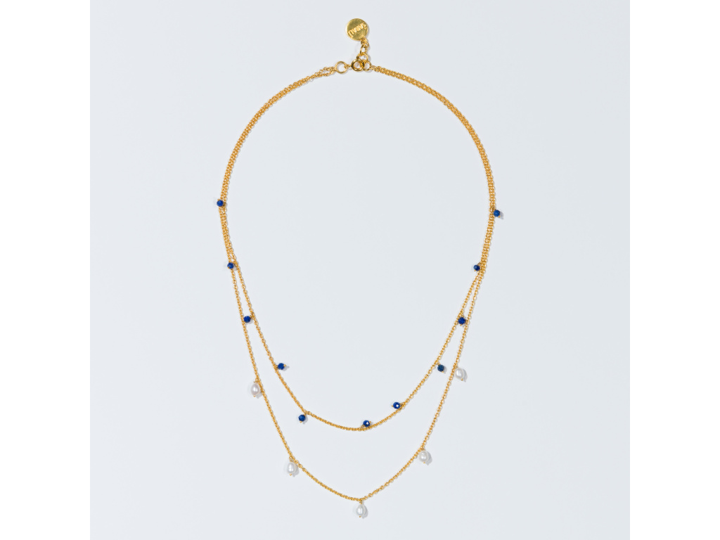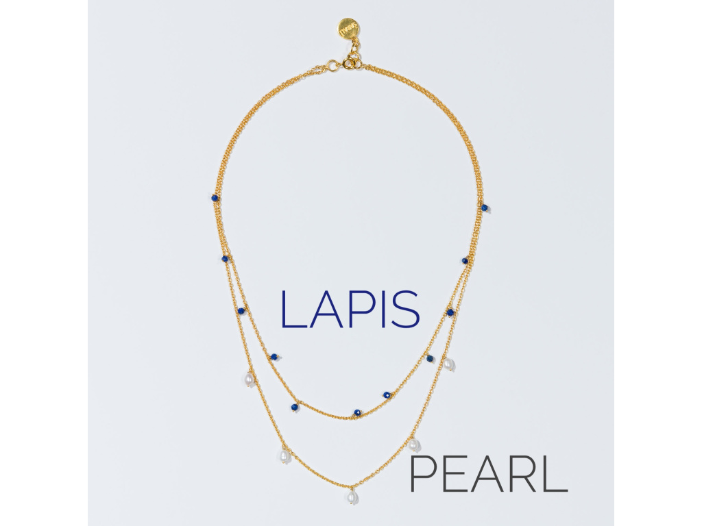 Jemný vrstvený náhrdelník, který zaujme svou čistou elegancí a krásným kontrastem barev. Pozlacený řetízek ve dvou liniích zdobí drobné kamínky lapisu lazuli v hlubokém modrém odstínu a něžné sladkovodní perly, které šperku dodávají jemnost a nadčasový nádech.