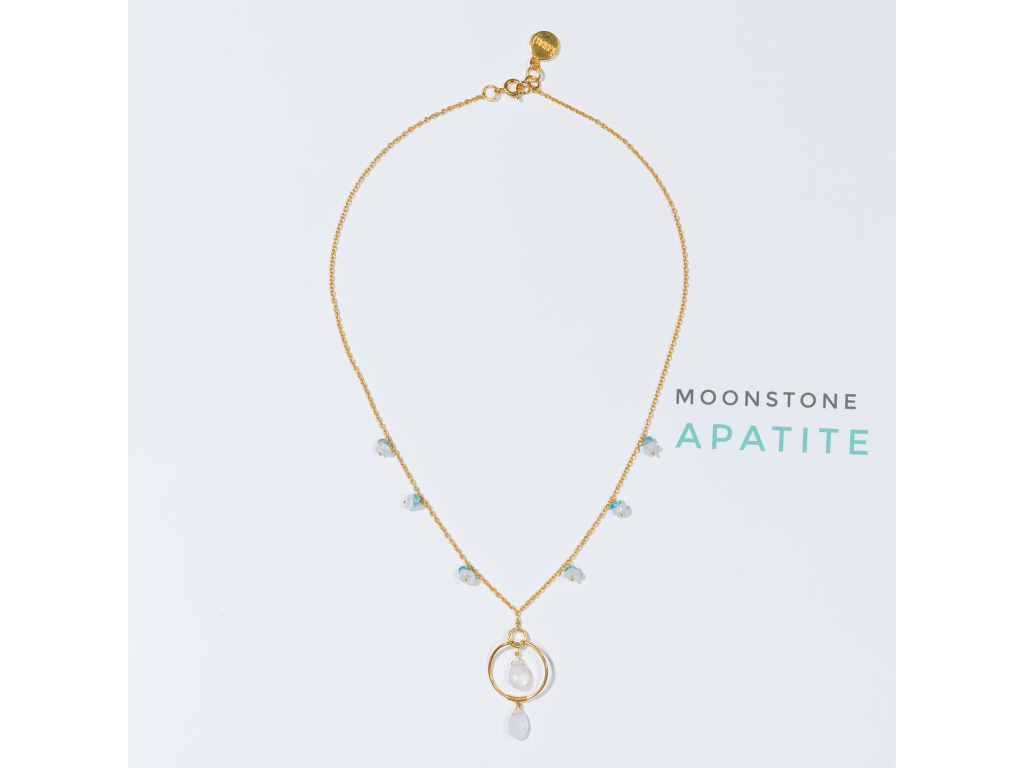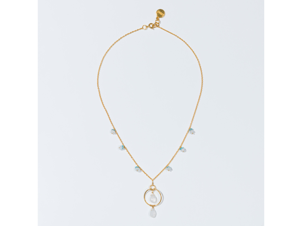 Jemný náhrdelník, který v sobě spojuje čistotu měsíčního kamene a svěží modré tóny apatitu. Lehký řetízek zdobí drobné kamínky po celé délce a dominantou je elegantní kruhový detail s kapkami, které se při pohybu krásně třpytí. Ideální pro vrstvení i jako samostatný šperk, který dodá outfitu něžný, ale výrazný akcent.