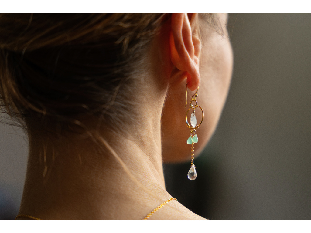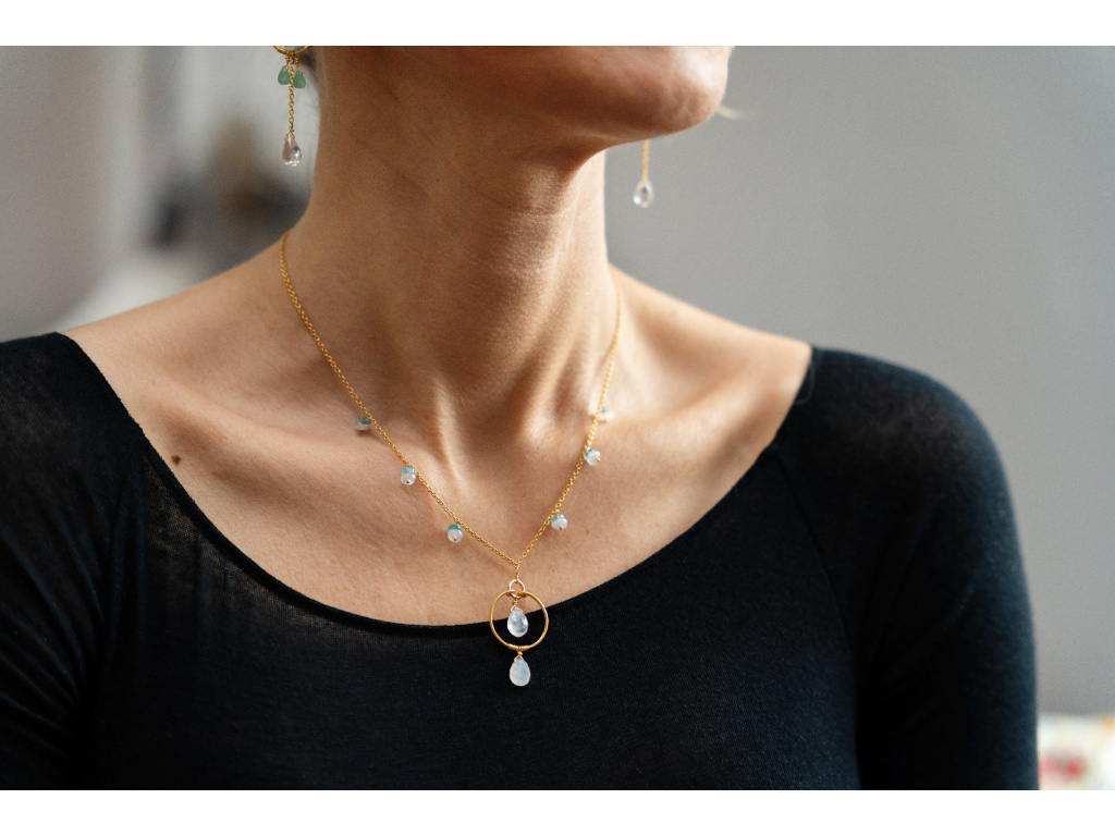 Jemný, svěží a dokonale sladěný set, který rozzáří každý outfit. Kombinace pozlaceného řetízku a přírodních kamenů v chladných tónech působí elegantně a lehce – jako kapky ranní rosy. Náhrdelník zdobí drobné apatity a výraznější přívěsek s měsíčním kamenem, zatímco náušnice doplňují celkový vzhled měsíčním kamenem, chryzoprasem a čirým křišťálem, který se při pohybu nádherně třpytí.