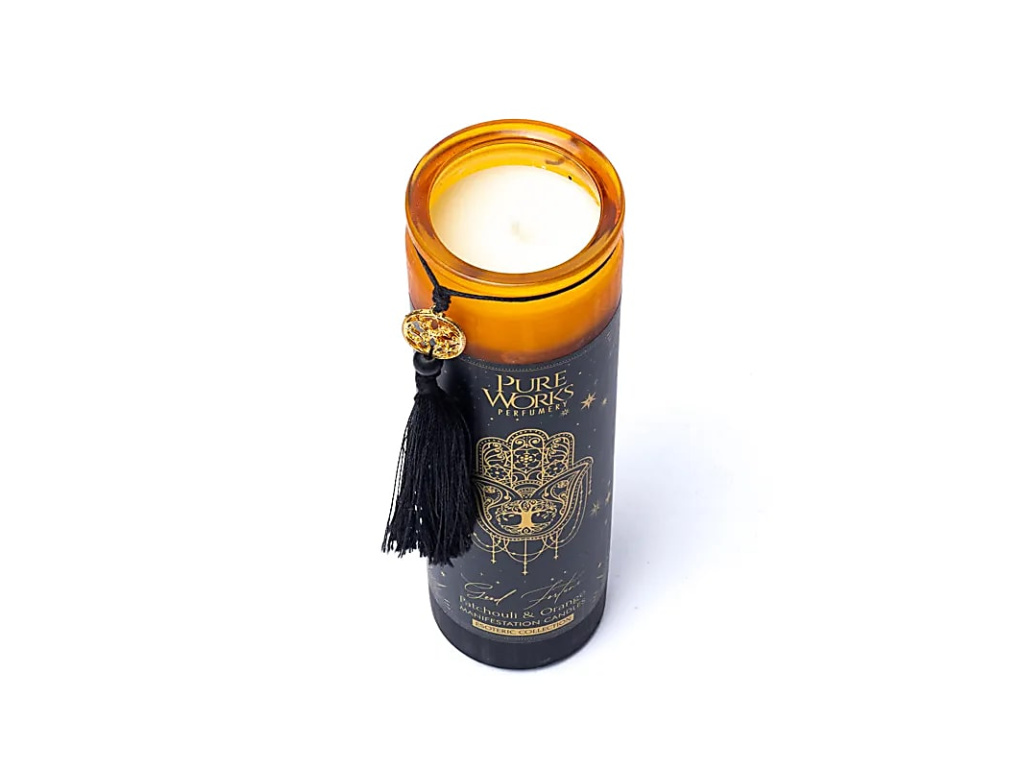 Lesklá manifestační svíčka ve vysoké nádobě s ozdobným střapcem z barevného skla je ručně tvořená ze sójového a palmového vosku bez toxinů a esenciálních olejů.