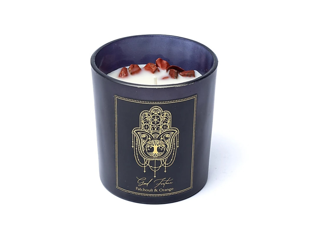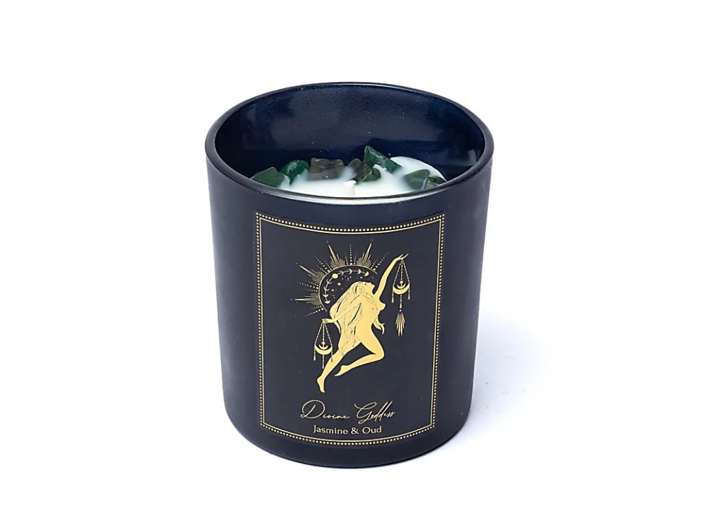 Lesklá manifestační svíčka ve skle, ručně litá ze sojového a palmového vosku bez toxinů. S esenciálními oleji a drahými kameny. Jak svíčka hoří, drahokamy klesají spolu s voskem. Když svíčka dohoří, můžete si drahokamy uložit.